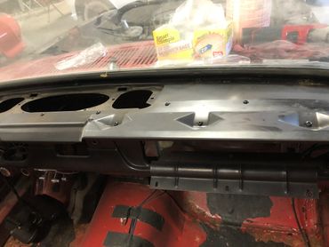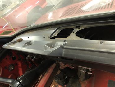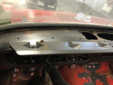 The vinyl & foam dash pad mounts to the inner structure via the steel dash pad support bracket. This support bracket is attached to the inner structure with several screws, while the mass production units were spot welded together.