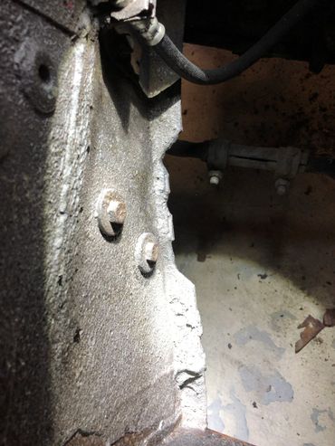 The steering idler arm is held onto the frame with two bolts and washers (outer frame side) and threaded nuts (inner frame side). The outer washers, on the very earliest pre-production units, were fairly small in diameter when compared to the bolt hole diameter. Later pre-production units, along with all of the mass production cars, were upgraded with larger diameter washers that provided increased surface area and strength.