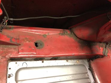 Just to the left of the gas tank there are two holes, which give access to the rear tie-down mount used for transportation purposes. This is not unique and can be found on Mustangs throughout the late 1960's. The holes are typically finished off with a molded plastic plug, as shown above in picture #4. This picture came from another pre-production Mustang.